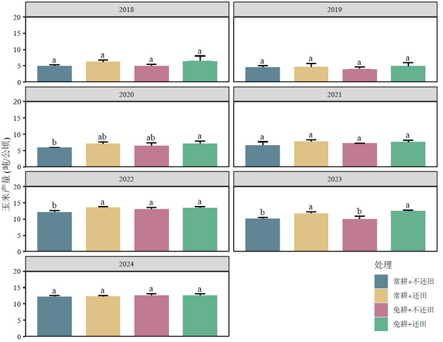 总体而言,常规耕作结合秸秆还田(CTSR)处理实现了最高的小麦和玉米产量。然而,作物对管理措施的响应存在显著差异: