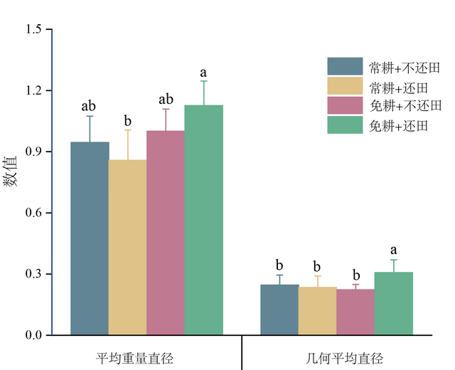 在免耕结合秸秆还田处理下,土壤的大团聚体比例和平均重量直径最高,表明该处理最有利于维持稳定的土壤结构。